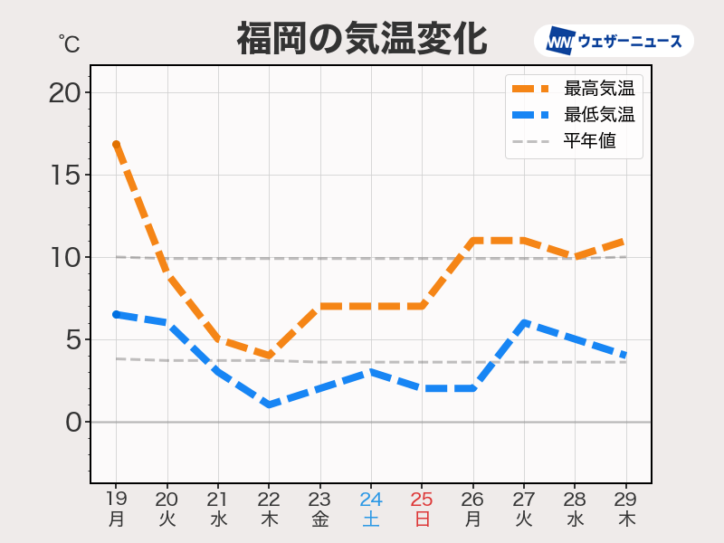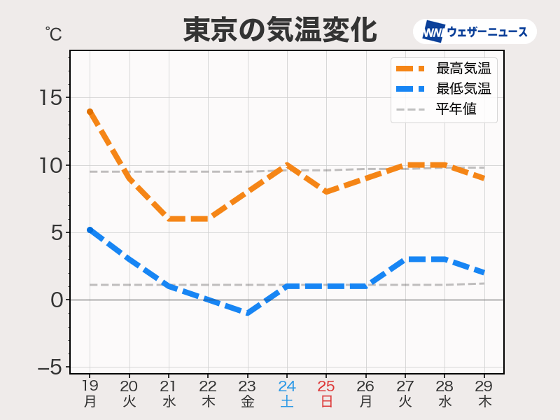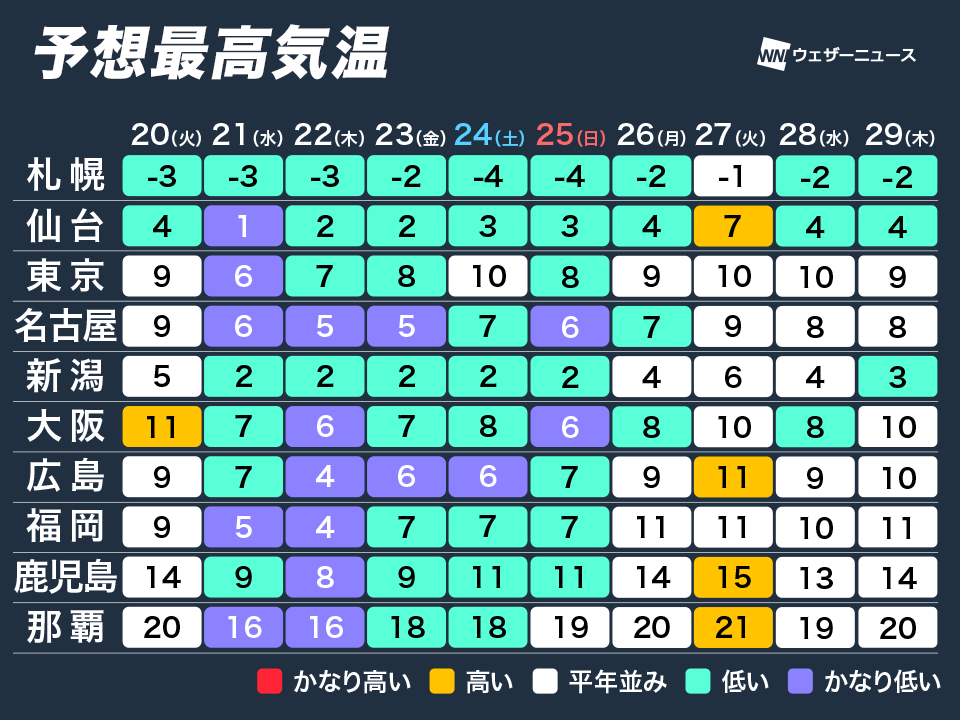 大陸から南下する寒気の影響を受けやすい東海や西日本は、さらに気温の低い日が継続します。福岡や大阪、名古屋でも最高気温は一桁の日が続き、5〜7℃くらいまでしか上がらない日が多くなります。