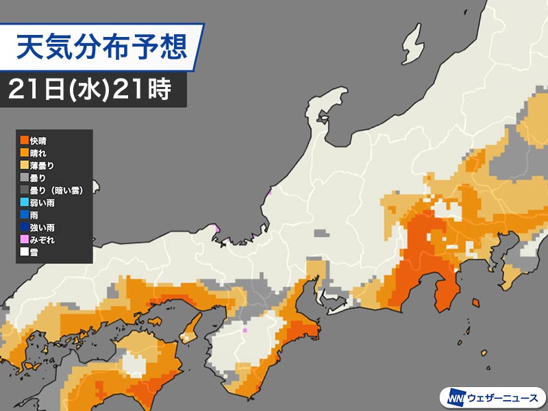 寒気のピークとなる21日(水)の夜から22日(木)の朝は、上空5500m付近で−42℃以下の寒気の中心が北陸から東北を通過する予想です。この影響で雪雲が発達し、雪雲が日本海側にとどまらず太平洋側まで拡大する可能性があります。若狭湾から濃尾平野に雪雲が広がり、滋賀県や岐阜県、三重県北部などで雪が降る見込みです。