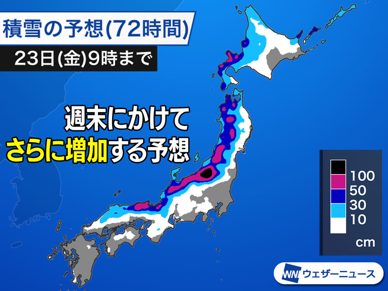 明日20日(火)から23日(金)朝までの積雪増加量は、東北や北陸、関東甲信北部、近畿北部の山沿いの多い所で50cmを超え、局地的には100cm前後に達する予想です。そのほか、北海道から北陸の広い範囲で30cmから50cm、近畿北部や山陰でも30cm前後の雪が積もるとみられます。