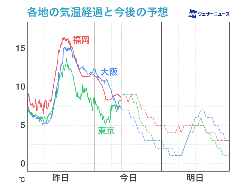 西日本や東海は日中は気温がほとんど上がらず、朝よりも寒くなるところも多い予想です。