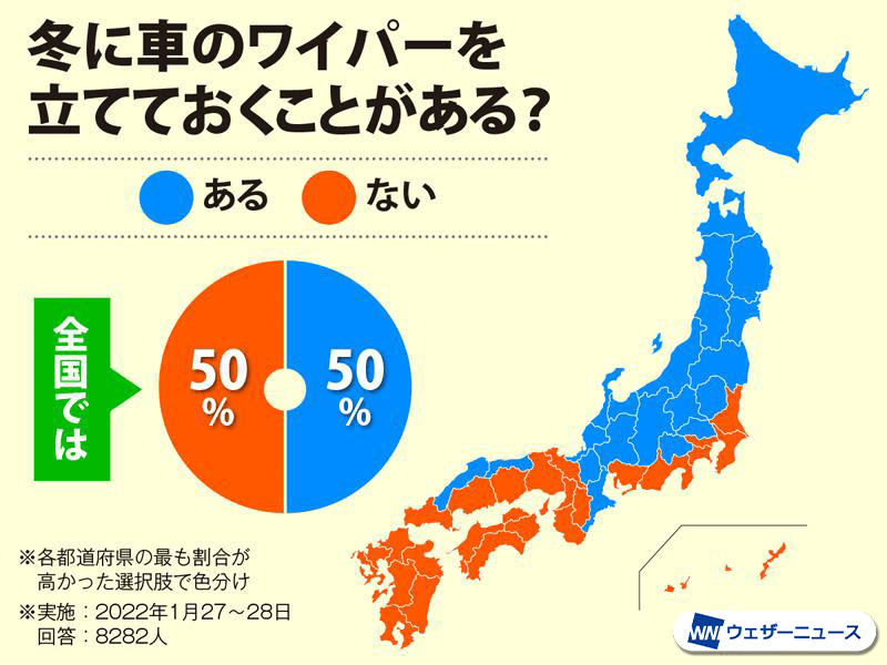 実際にウェザーニュースで「冬に車のワイパーを立てておくことがある?」というアンケート調査を行ったところ、全体では「ある」「なし」がちょうど半々だったのに対して、都道府県別にみると地域の差が一目瞭然。北海道・東北・北陸地方や、西日本の日本海側などでは、「ある」の回答が多い結果となりました。