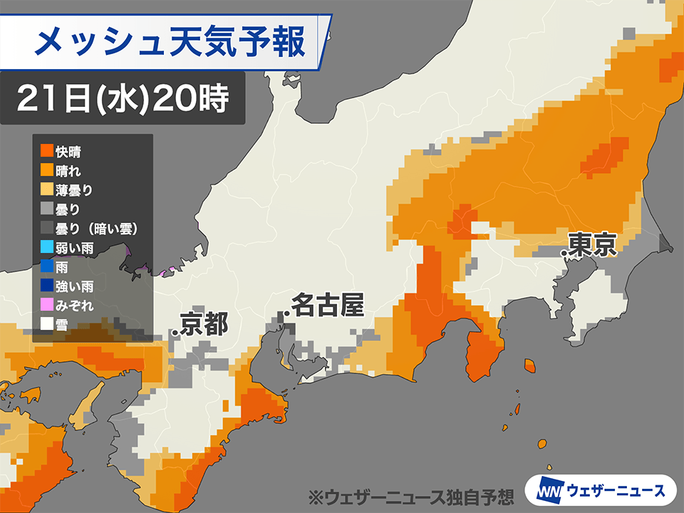 移動を予定している方は最新の情報に注意し、時間に余裕を持ってお出かけください。風向きによっては名古屋市周辺でもうっすら雪化粧する可能性があります。京都市周辺など西日本の太平洋側でも雪の積もる可能性があります。