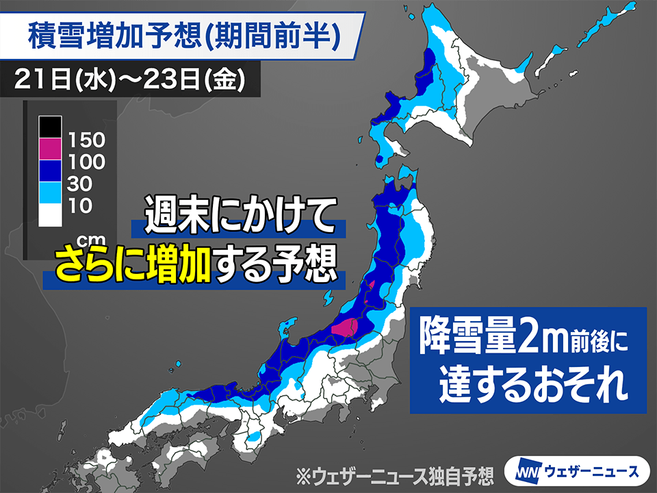 そのなかでも寒気の南下がピークとなるのは、今日21日(水)〜明後日22日(木)と、25日(日)前後の2回とみられ、このタイミングで特に雪の強まる所が多くなります。