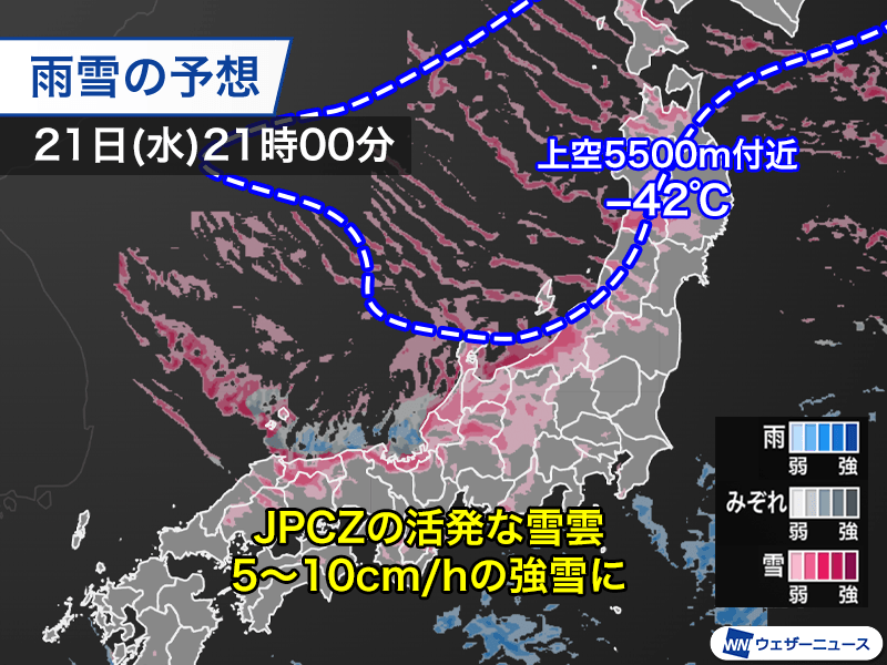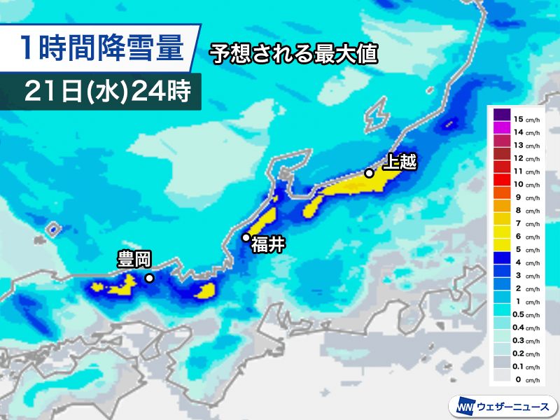 今夜遅くから明日22日(木)の早朝に雪が強まるとみられ、局地的には1時間に5〜10cmの降雪が予想されます。明日の朝6時までの12時間で、内陸部や山沿いを中心に20cm以上の積雪増加となり、多い所では30〜50cmに達する見込みです。