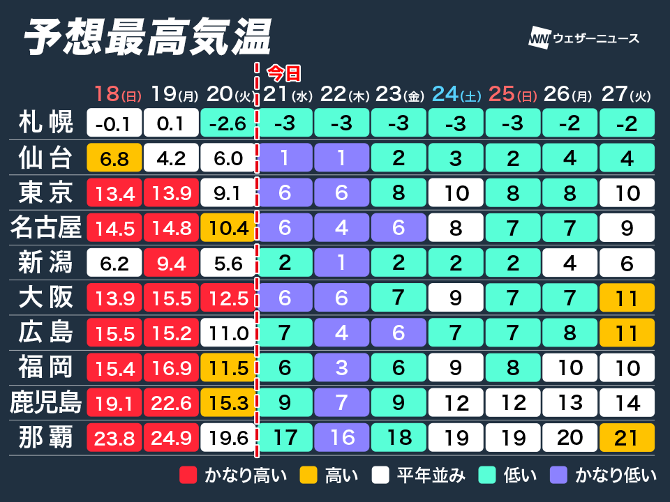 北日本は雪の降る日が続き、さらに厳しい寒さとなりそうです。仙台や秋田では最低気温が−3℃くらいの日が続きます。札幌では最高気温も氷点下の真冬日が継続する予想です。