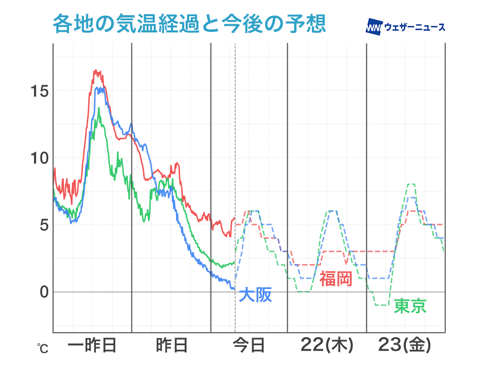 強い寒波が一段落する来週も寒気が流れ込みやすく、関東から西の太平洋側でも最高気温は10℃に届くかどうかといった日が続く予想です。長引く寒さで体調を崩さないようお気をつけください。