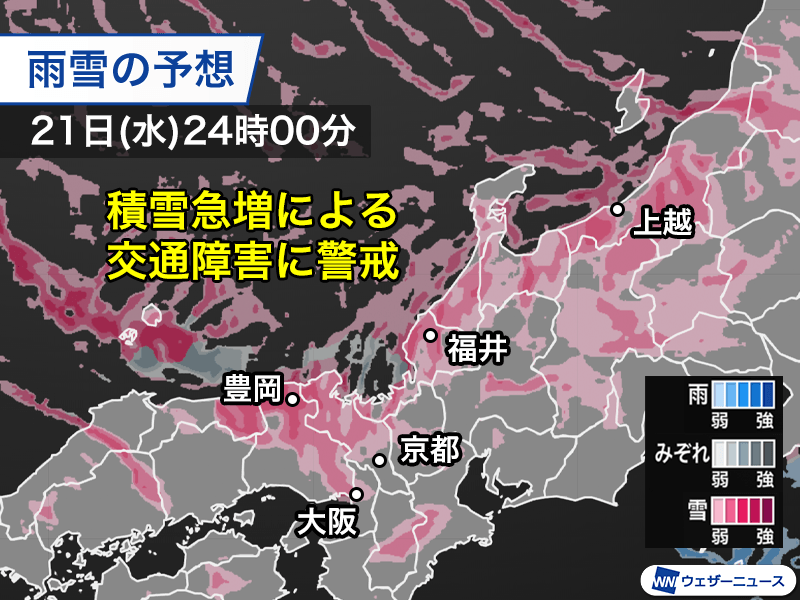 今夜遅くから明日22日(木)の早朝に雪が強まるとみられ、局地的には1時間に5〜10cmの降雪が予想されます。