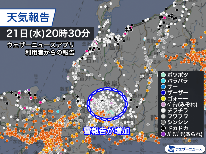 また、雪雲の一部は滋賀県北部から岐阜県、愛知県へと広がっていて、岐阜県本巣市・樽見では20時までの1時間に6cmの降雪を観測。ウェザーニュースアプリ利用者からの天気報告では、岐阜県美濃から愛知県北部で雪の報告が増加してきました。