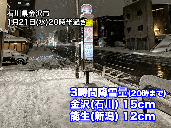 石川県など北陸西部の強い雪は22時前後まで続き、新潟県上中越では今夜いっぱい活発な雪雲が停滞するため積雪が急増する見込みです。立ち往生やスリップ事故をきっかけにした車両滞留に警戒をしてください。