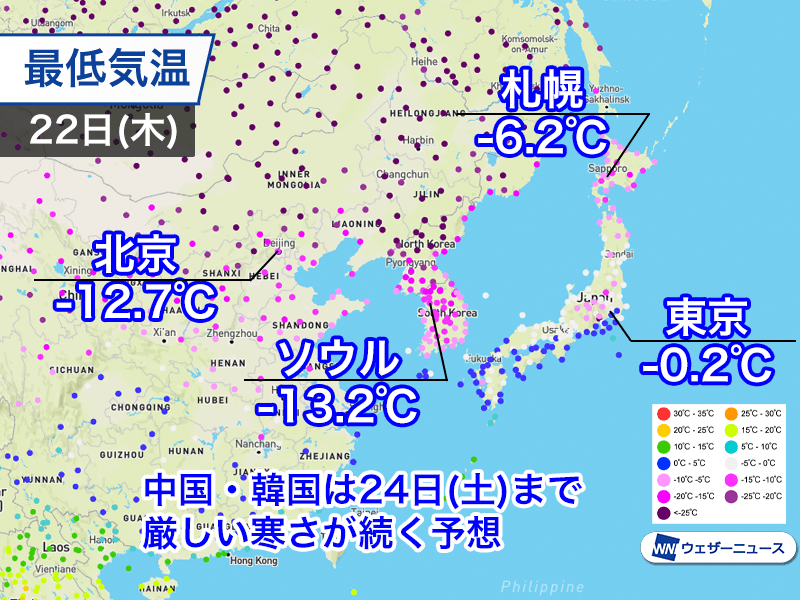 今日22日(木)の最低気温は韓国のソウルで−13.2℃まで低下。この冬一番の寒さで、4日続けて−10℃以下まで下がりました。中国では北京で−12.7℃とこちらは5日連続の−10℃台です。