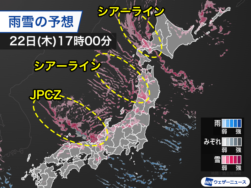 また、JPCZに伴う雪雲は濃尾平野にも拡大し、岐阜県の西濃で10cm以上、三重県北部や愛知県西部でも雪の積もる所があります。路面状況の悪化による交通障害や、落雪、雪崩による事故などに警戒が必要です。