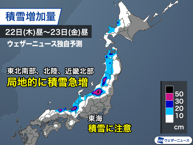 明日23日(金)昼までの24時間の積雪増加量は北陸や近畿北部の多い所で30〜50cmに達し、局地的には50cmを超える可能性があります。北海道や東北北部の日本海側でも20cm前後の雪の積もる所がある予想です。