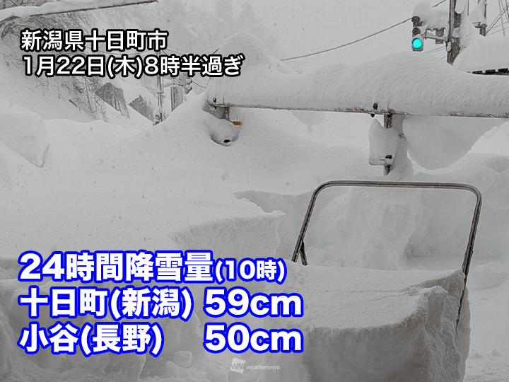 北陸や長野県、近畿北部を中心に雪が強まり、10時までの24時間降雪量は新潟県十日町市で59cm、長野県小谷村で50cm、滋賀県彦根市で29cm、金沢市で23cmを観測しています。短時間で積雪が急増したため、昨夜は石川県、今日の未明は滋賀県で「顕著な大雪に関する気象情報」が発表されました。