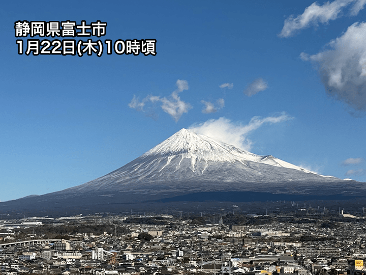 昨日21日(水)はシアーライン(風の流れが変化する境界線)の影響で、関東南部から静岡県東部では雪や雨の降った所が多くなりました。その影響で富士山の裾野でもしっかりと雪が降り、雪化粧をしています。