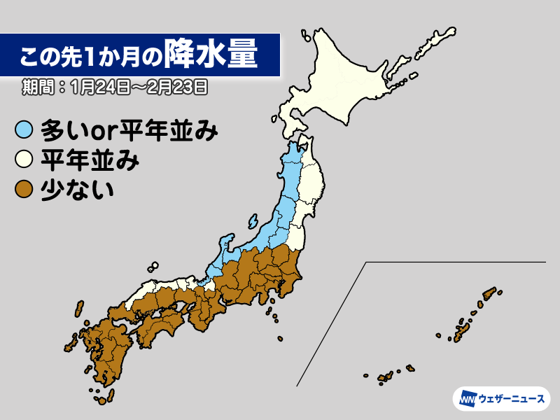 関東から西日本の太平洋側は低気圧の影響を受けにくく、降水量は平年よりも少ない予想となっています。特に年明けから雨や雪の少ない状態が続いていることもあり、空気の乾燥がより進む見通しです。
