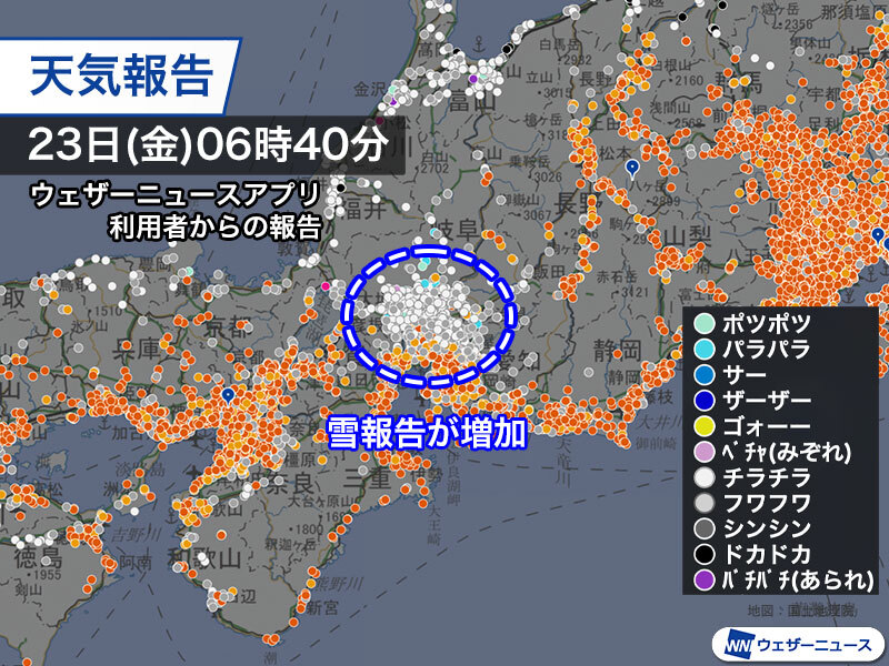 ウェザーニュースアプリのユーザー投稿「ウェザーリポート」では現地から雪の報告が多く届いています。