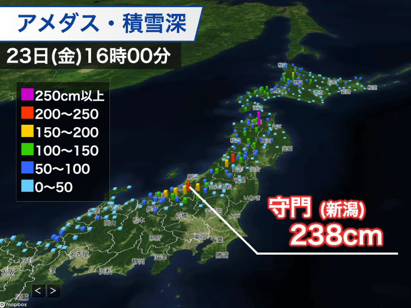 特に、朝から活発な雲がかかり続けている新潟県魚沼市のアメダス守門は16時までの12時間で28cmの雪が降り、積雪深は238cmに達しました。寒波襲来前の20日(火)0時に比べると、130cm以上の積雪増加です。
