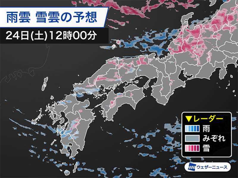 今日24日(土)は九州北部や四国ですでに雪が降り出しており、積もる可能性があります。近畿や山陰も雪や雨の降るところがありそうです。