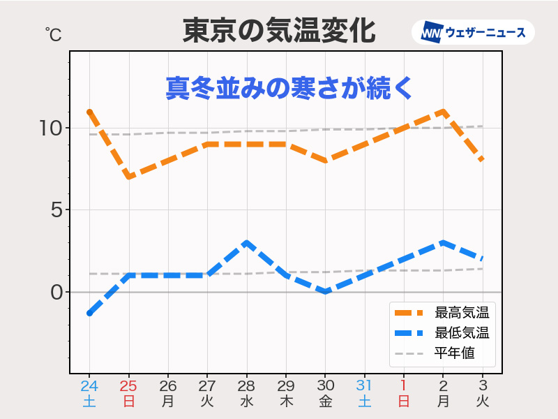 26日(月)には強い寒気は後退して厳寒のピークは過ぎるものの、来週後半も全国的に真冬並の寒さが続きそうです。