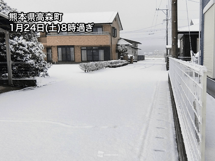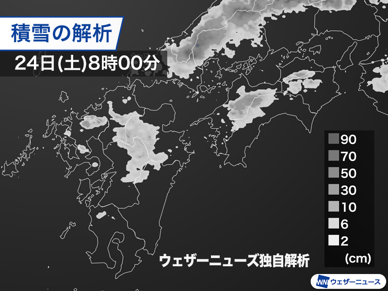 積雪計が少ないため実際に観測されているのは熊本県南阿蘇村の1cmだけですが、ウェザーニューズの解析による積雪分布では熊本県から大分県、愛媛県から高知県の山沿いで雪が積もっているとみられます。標高の高い地域では10cm前後を解析している地域もある状況です。