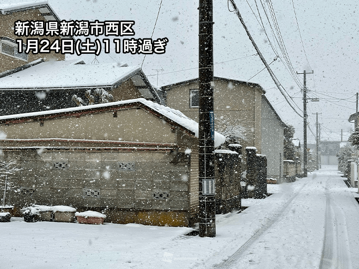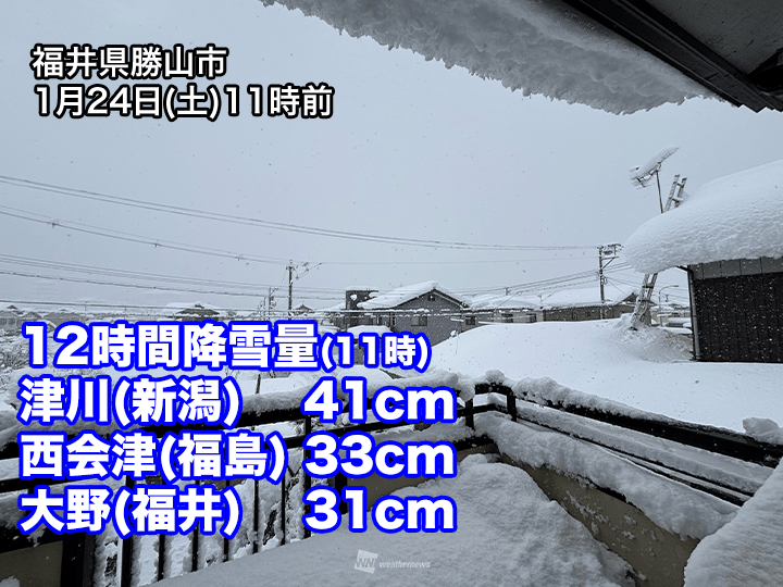 一連の寒波で2回目のピークになり、特に北陸周辺で雪雲が発達している状況です。11時までの12時間降雪量は新潟県阿賀町・津川で41cm、福島県西会津町で33cm、福井県大野市で31cmを観測しています。昨日の夕方までは積雪が0cmだった新潟市でも11時には12cmまで増加しました。