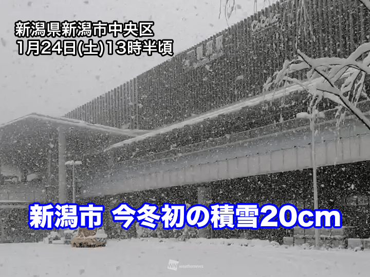 寒気の中心が北陸付近に近づいてきたため風の流れが変化し、山形県の沖合から吹き込む北寄りの風と、佐渡島と能登半島の間を吹く西北西の風がぶつかることで下越の沿岸部でも雪雲が発達。14時の積雪は新潟市で26cmと今冬初めて20cmに到達しました。