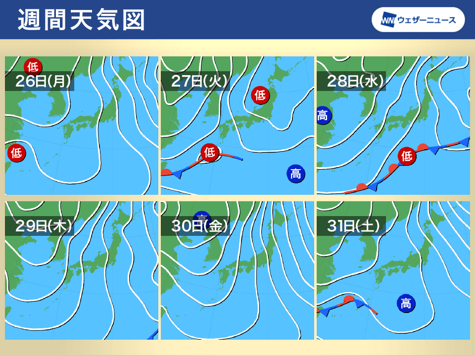 28日(水)〜30日(金)にかけては冬型の気圧配置となって、再び日本付近に寒気が流れ込みやすくなります。日本海側の地域を中心に雪の降る日が続く予想です。