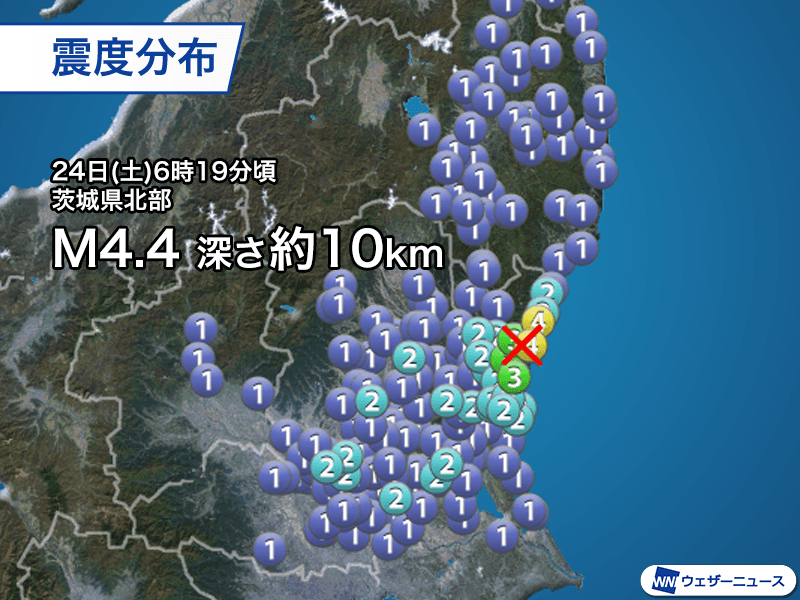 24日(土)6時19分頃、茨城県北部を震源とするマグニチュード4.4、深さ約10kmと推定される地震が発生しました。この地震で茨城県日立市で最大震度4、常陸太田市、東海村で震度3を観測しています。