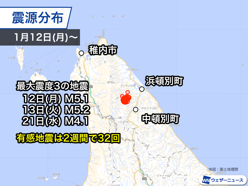 国内:北海道宗谷地方で地震活動が活発