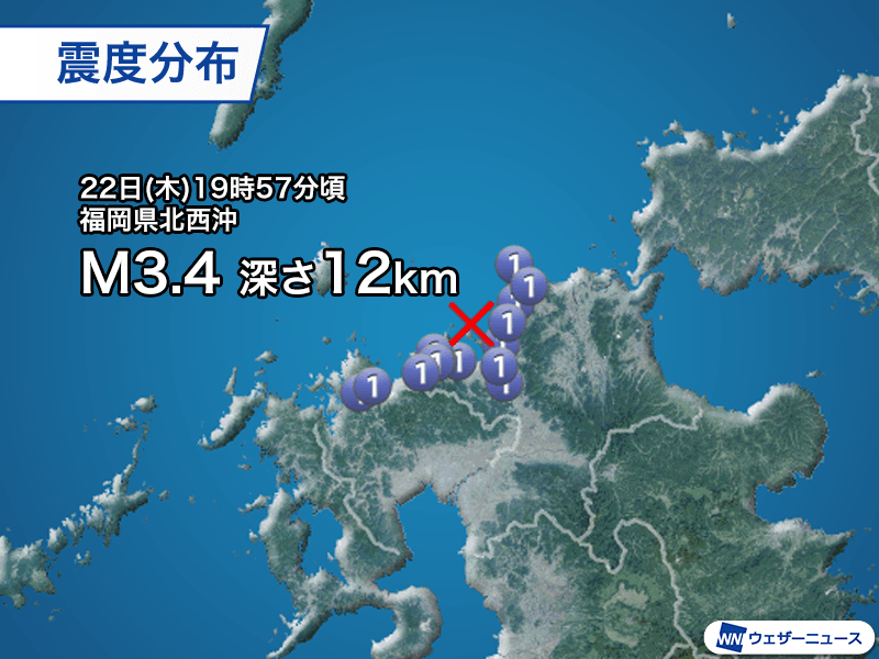 22日(木)0時08分頃、福岡県北西沖を震源とするマグニチュード3.4、深さは12kmと推定される地震が発生しました。この地震で福岡市、春日市、宗像市、福津市、糸島市、新宮町、佐賀県唐津市で最大震度1を観測しています。
