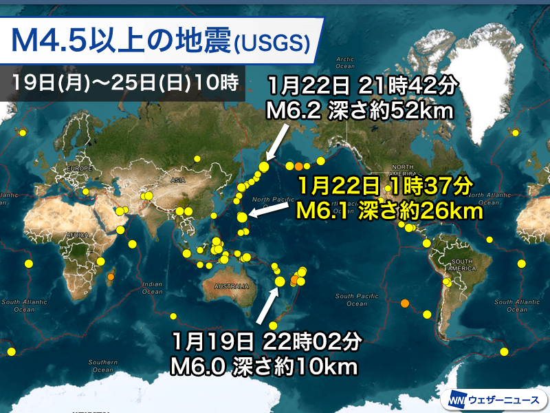 アメリカ地質調査所の解析によるマグニチュード6以上の地震は3回発生しています。最も大きな地震はカムチャツカ半島の沖で発生したマグニチュード6.2です。