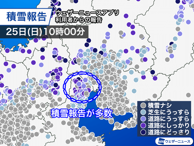 一方で、ウェザーニュースアプリ利用者からの投稿では、岐阜県や愛知県との県境に近い地域で、「道路にしっかり積雪」や「道路にどっさり積雪」という報告が多数届いています。