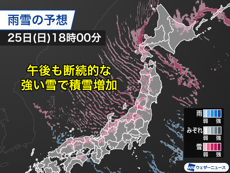 近畿北部や東海などの雪は夕方まで、北陸から北日本は明日26日(月)の早朝まで雪の強まる所がある見込みです。