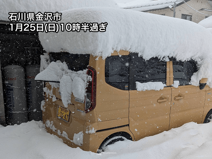 そのほか、北陸や長野北部、近畿北部などの山沿いで積雪が急増し、11時までの12時間降雪量は長野県飯山市で49cm、新潟県妙高市・関山で46cm、兵庫県香美町・兎和野高原で36cmを観測しました。