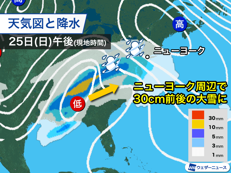 現地時間の25日(日)の午前中から26日(月)の朝にかけて断続的に雪が降り、ニューヨークの中心部でも1時間に5cm前後の降雪となるおそれがあります。