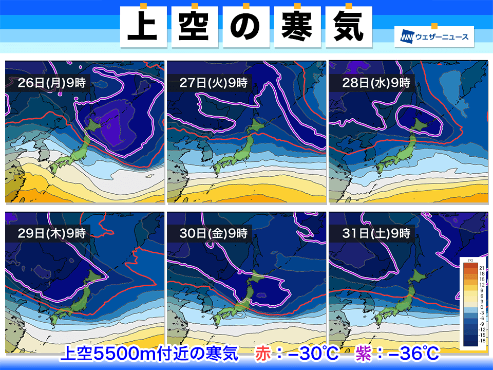 それも束の間で28日(水)頃には大雪の目安となる上空5500m付近で−36℃以下の寒気が、北海道に広がってくる見込みです。