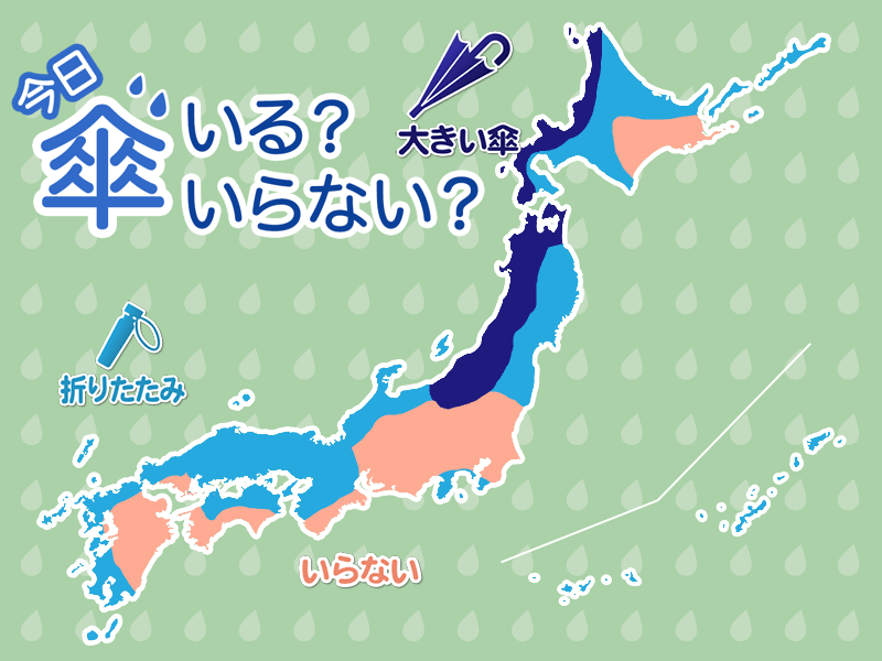 関東南部の沿岸や伊豆は午後から夜にかけてにわか雨やにわか雪の可能性あり。九州の東シナ海側や南西諸島も夜遅くなると雨が降り出すところがあります。ご帰宅の予定時刻次第で、折りたたみ傘をお持ちください。