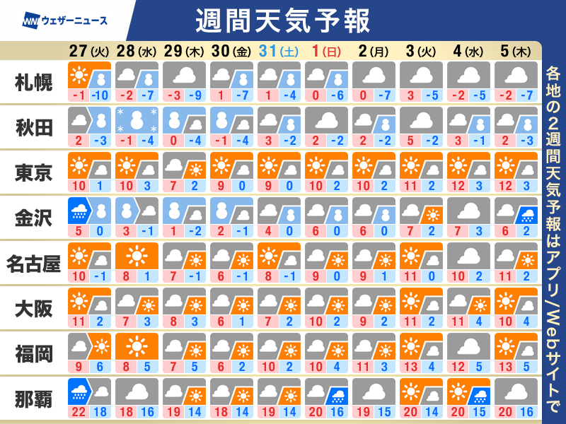 28日(水)から月末にかけては再び冬型の気圧配置となって、日本付近に寒気が流れ込みやすくなります。日本海側の地域を中心に雪の降る日が続く予想です。