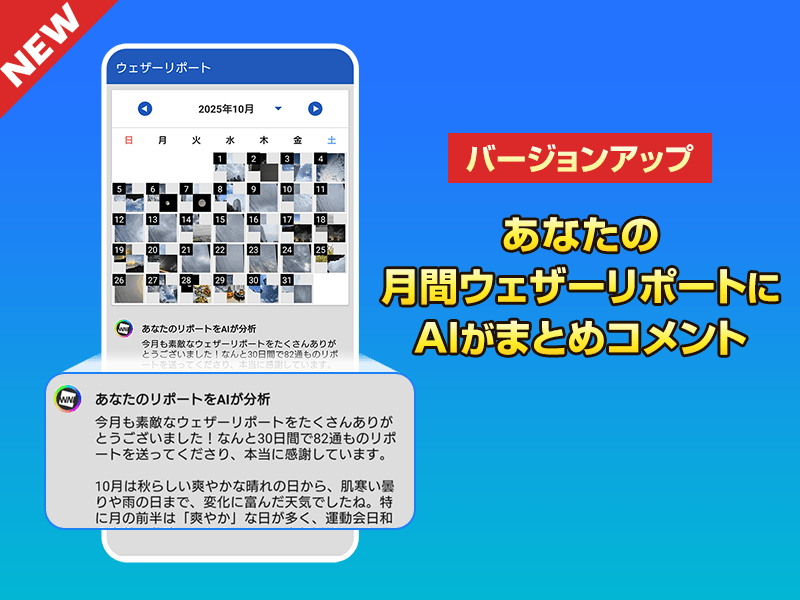 プロフィールのマイページからマイウェザーリポートのカレンダー表示ボタンを押すと、ウェザーニュース専用AIがあなたの月間リポートを分析し、まとめコメントをお届けします。(過去の投稿は「分析する」ボタンを押すと表示されます。)