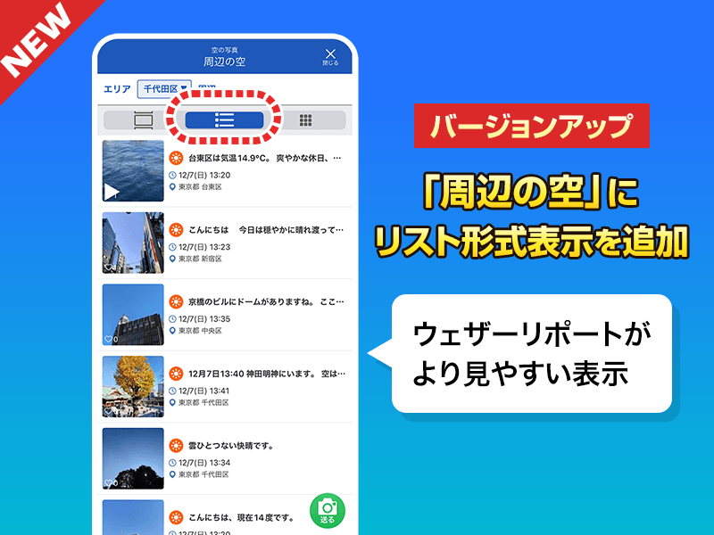 周辺のウェザーリポートの天気や空の様子をひと目で確認しやすいように改善しています。(今までの1列と3列表示もタブを切り替えてご覧いただけます。)