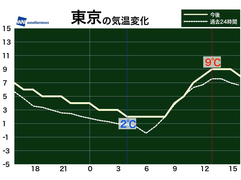 明日の朝も寒くなりますが、昼間は今日よりかなり気温が高くなります。このところ厳しい寒さが続いていましたが、明日は少しだけ防寒レベルを下げても良さそうです。