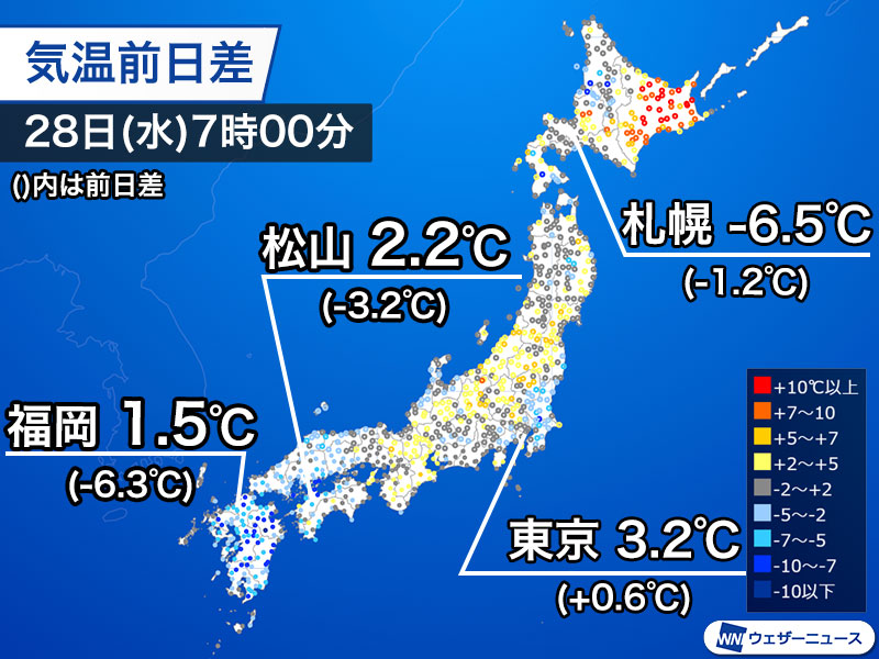 今日28日(水)は再び冬型の気圧配置となる影響で昨日よりも気温が低いところが多い見込みです。