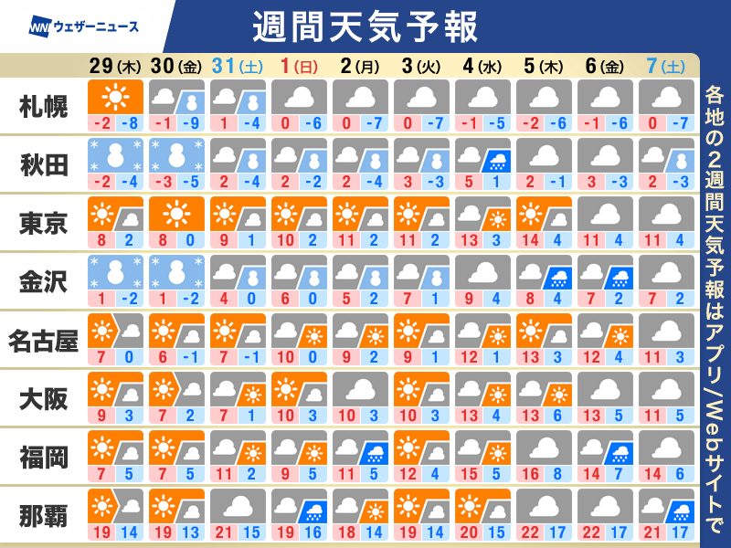 西日本や東日本でも最高気温は10℃に届かない日が多いほか、朝の冷え込みも強いため本州の内陸でも水道管凍結などのリスクが高まります。
