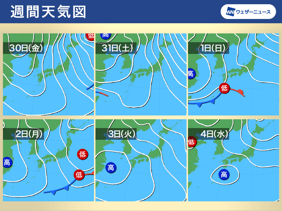 31日から2月1日にかけては、東シナ海から日本の南海上を低気圧や前線が通過します。低気圧や前線に近い九州南部では雨や雪の降る可能性があるものの、降水域は海上がメインで陸地にはあまり広がらない見込みです。