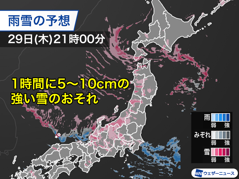今日29日(木)は寒気の南下に伴って、日本海側で雪が強まっています。今日の午後から明日朝をピークに積雪急増のおそれがあるため警戒が必要です。