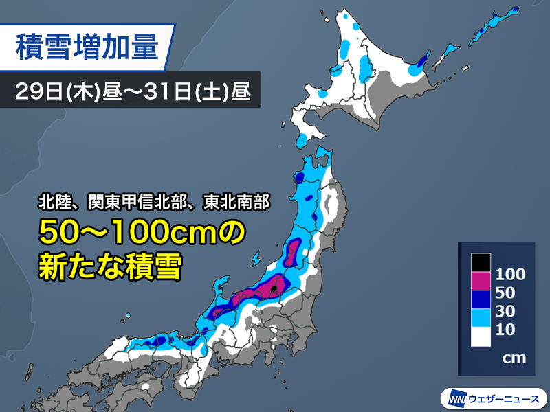これから31日(土)昼までの48時間の積雪増加量は、北陸、東北南部にかけての山沿いで50cm以上で、標高の高い地域では100cm前後に達する予想となっています。山陰や近畿北部、東北北部でも山沿いでは局地的に30〜50cmの雪が積もる見込みです。