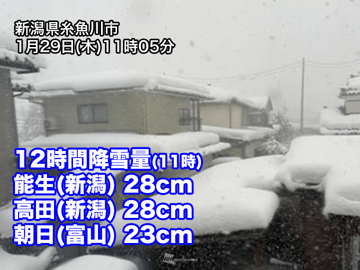 11時までの12時間降雪量は新潟県糸魚川市・能生と上越市・高田で28cm、富山県朝日町で23cm、兵庫県香美町・兎和野高原で22cmに達しました。金沢市でも13cmの雪が降り、積雪が38cmまで増加しています。