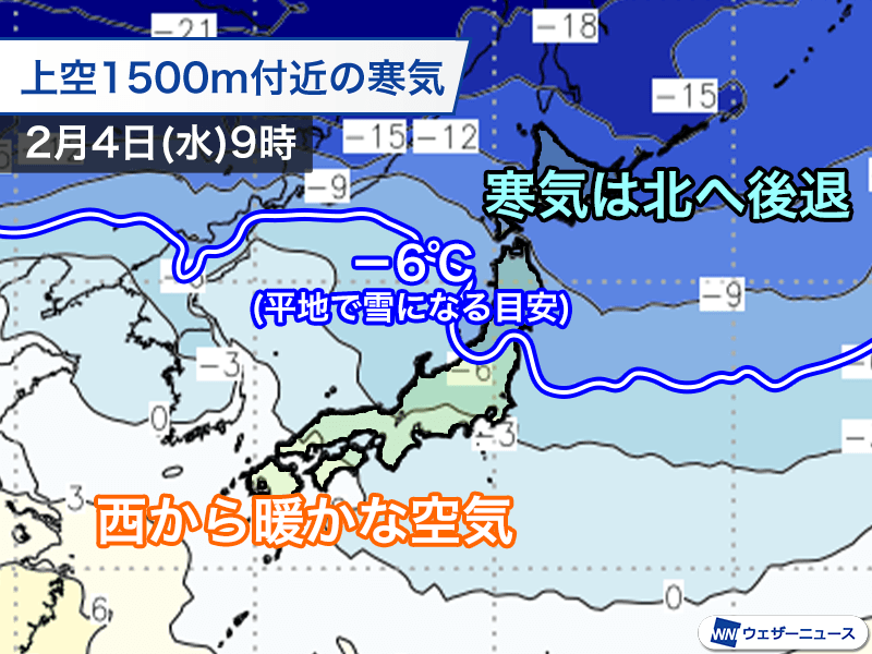 立春を迎える2月4日(水)になると天気のパターンに変化が現れ、寒気は大きく北へと後退します。