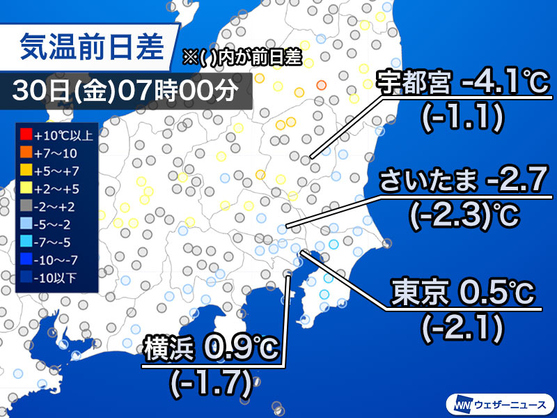 今日30日(金)の朝は関東で昨日より冷え込みが強まっています。昼間もさほど気温は上がらない予想となっており、風も冷たいためしっかり防寒するのが良さそうです。