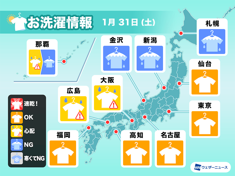 関東から四国の太平洋側では晴れるところが多く、空気も乾燥します。洗濯物が乾きやすく、外干しも問題ありません。